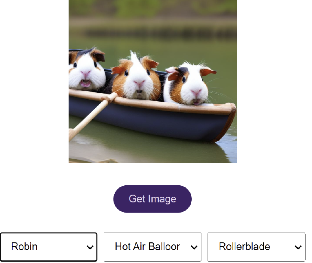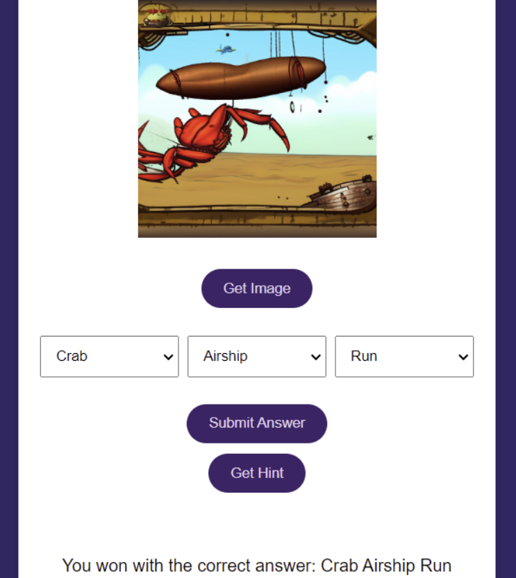 When playing the game, you need to guess the three image generation prompts that our server used. Each prompt will include a noun, an object, and an action. For example, in the scenario below, the correct answers would be Guinea Pig (noun), Canoe (object), and Paddle (action). I was responsible for ensuring that users can win if they correctly guess the prompts.